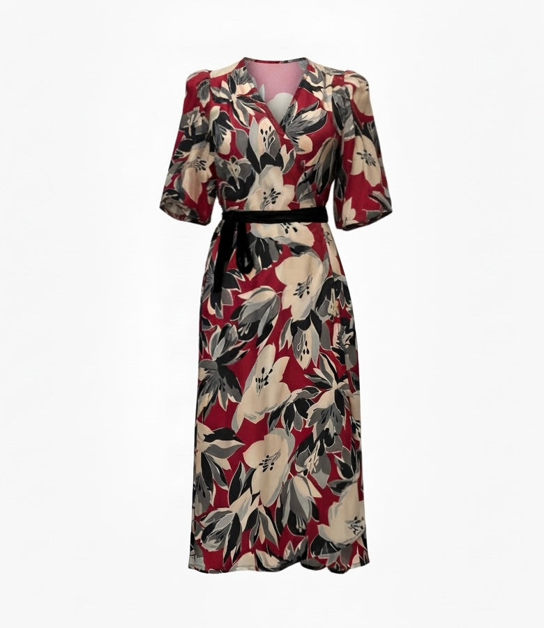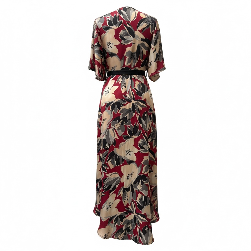 Robe portefeuille en soie imprimé fleurs. Manches amples. Jupon plus court sur le devant. Jolie amplitude!