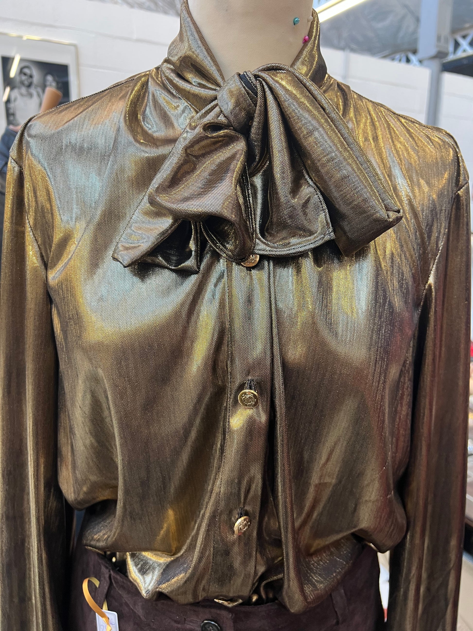 Blouse lavallière en lamé doré reflets noirs, boutons dorés.