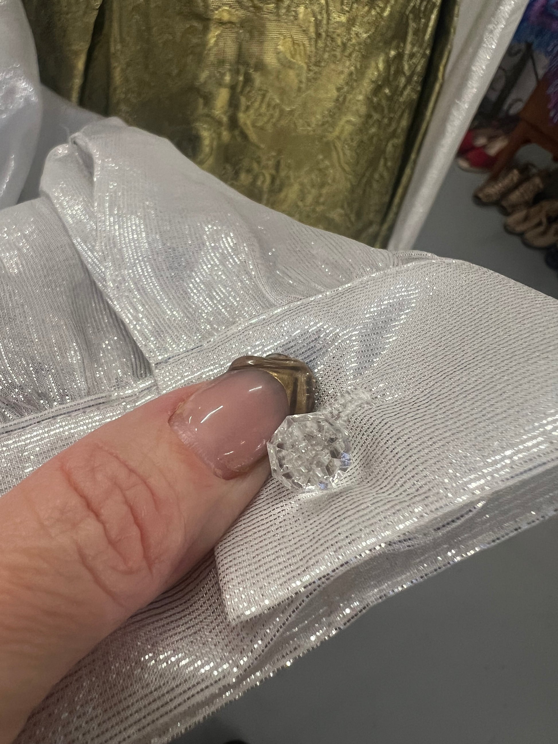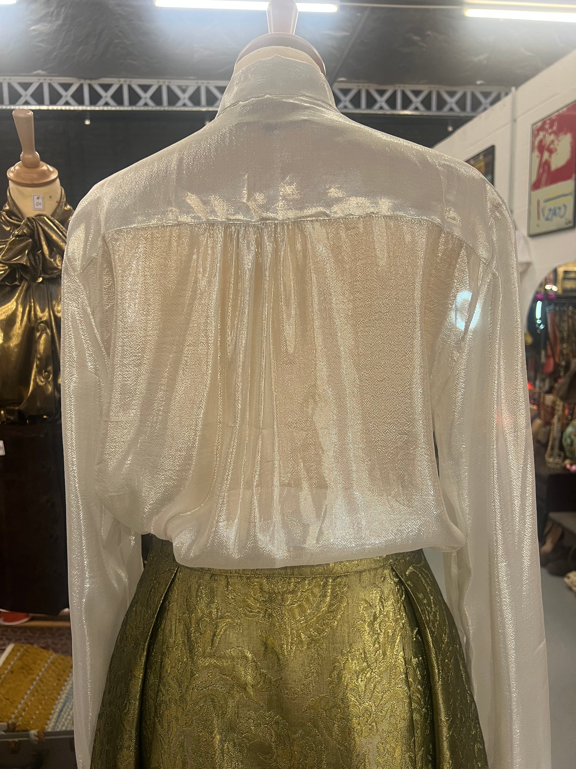 Lavallière en jacquard de soie français. Très longues manches, plis dans le dos et jolis boutons transparents à facettes.