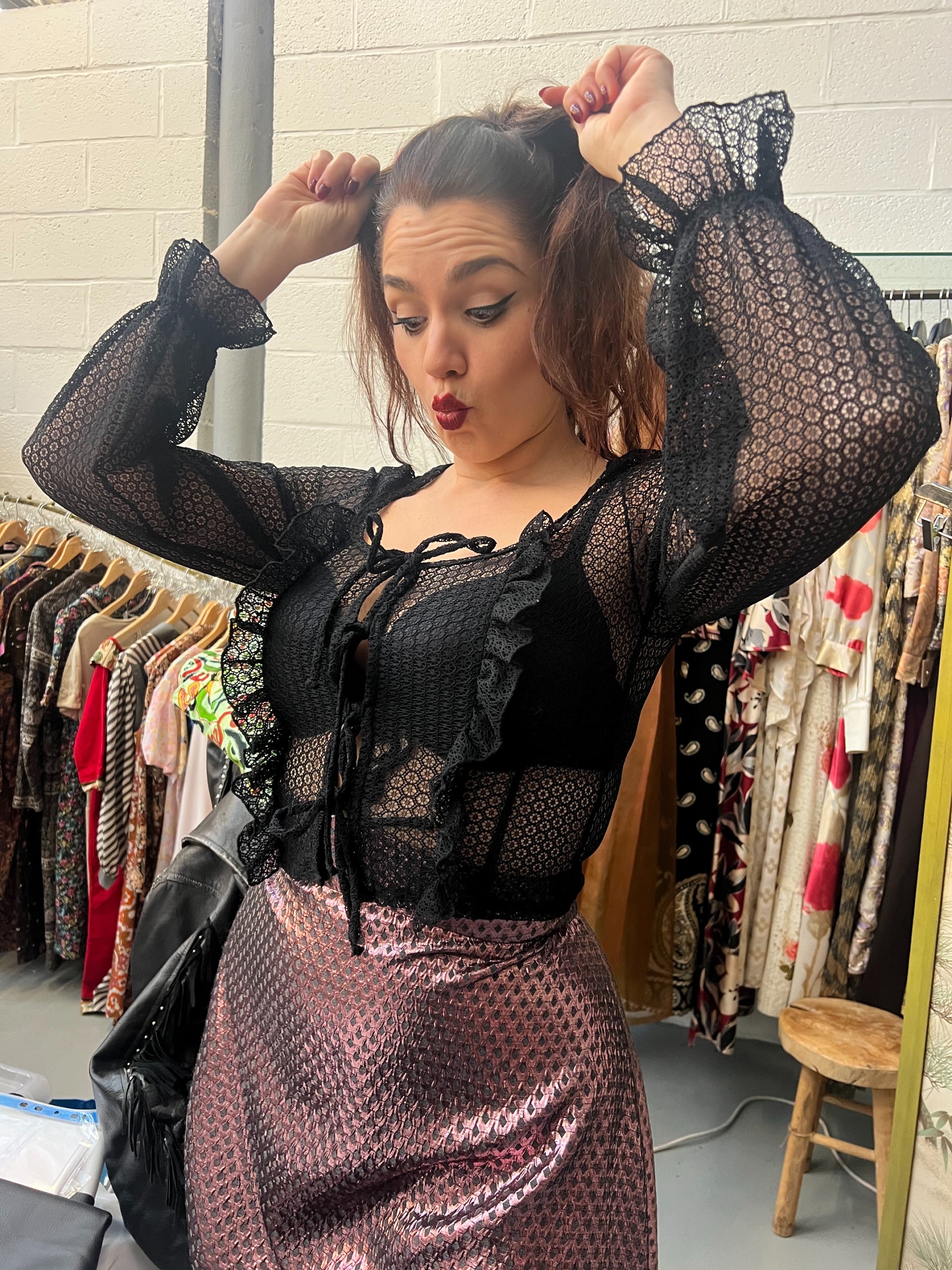 Jolie blouse en dentelle et élastane, petits volants et noeuds sir le devant. Élastiques aux poignets.