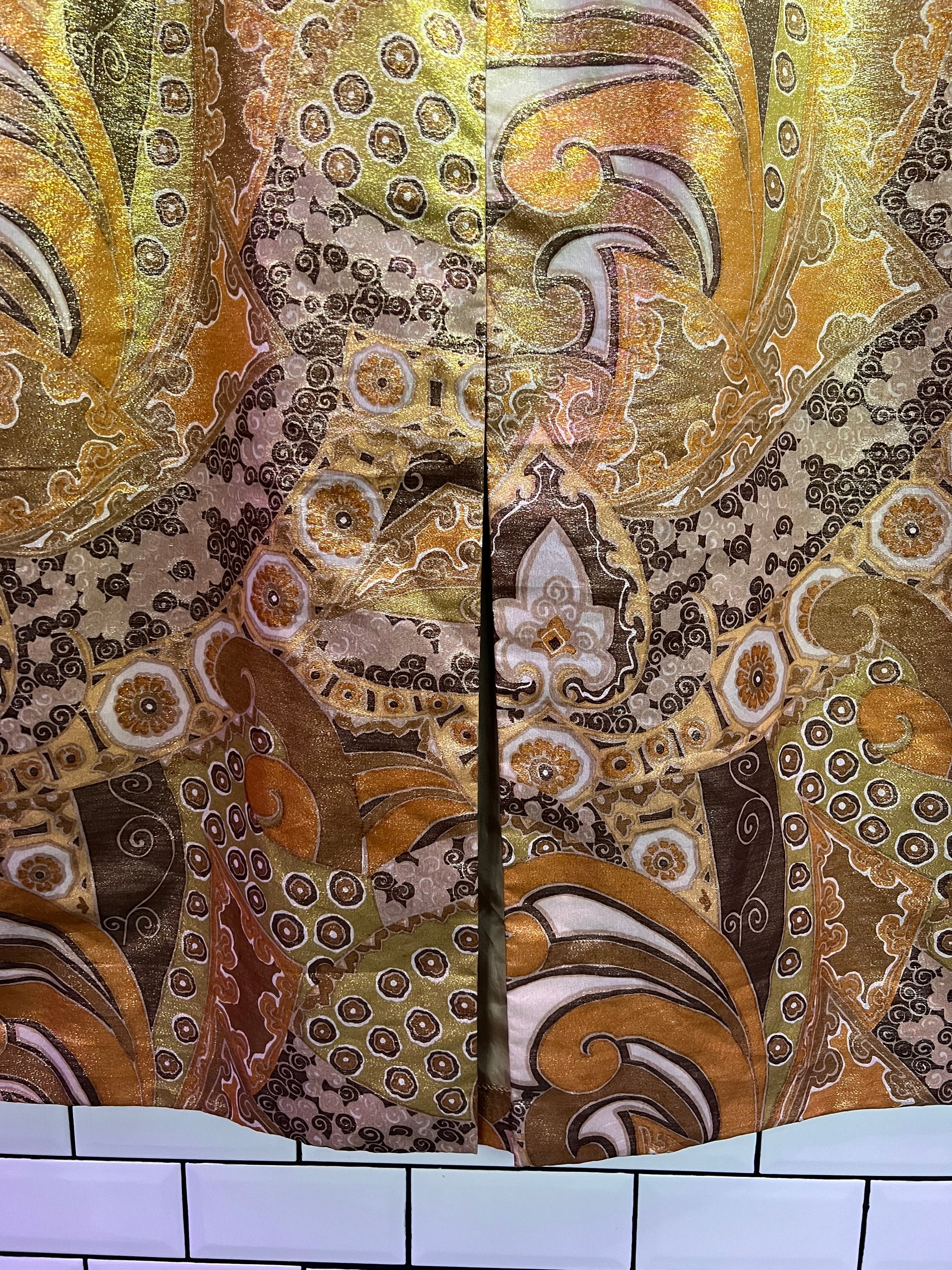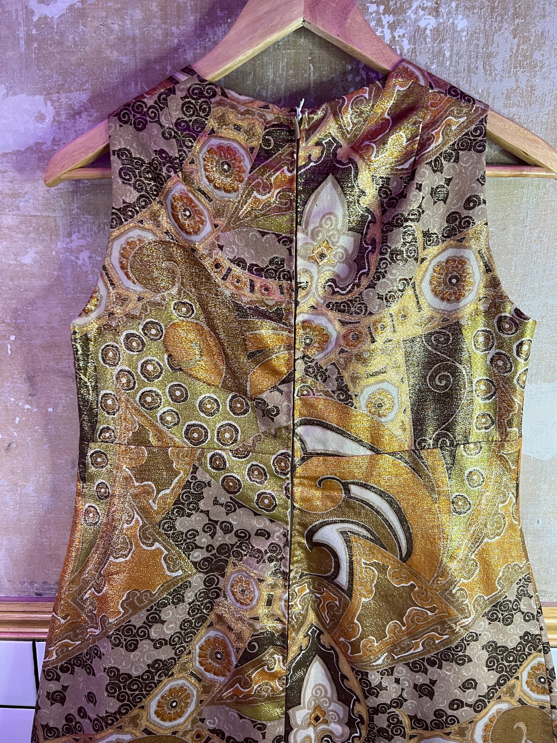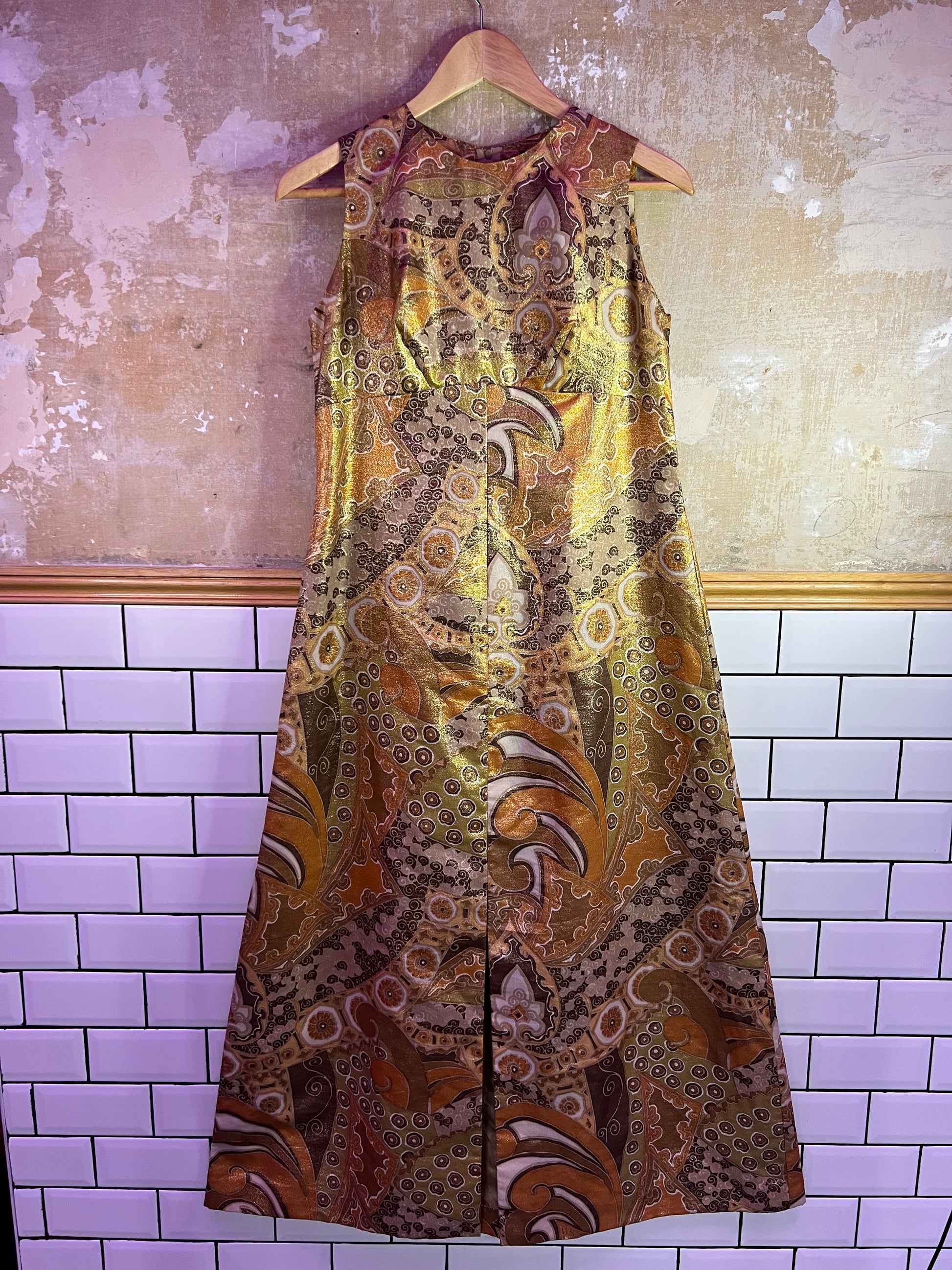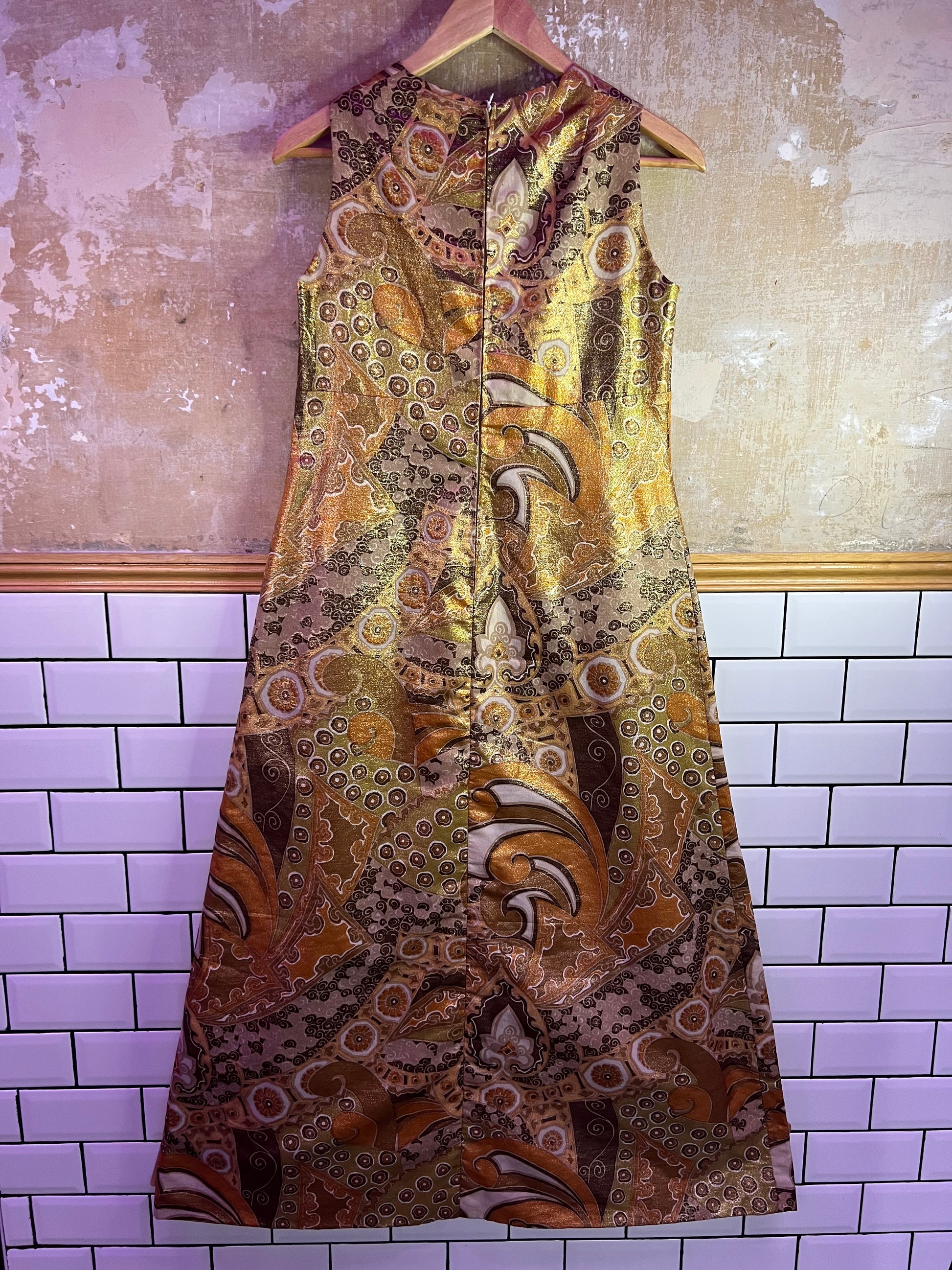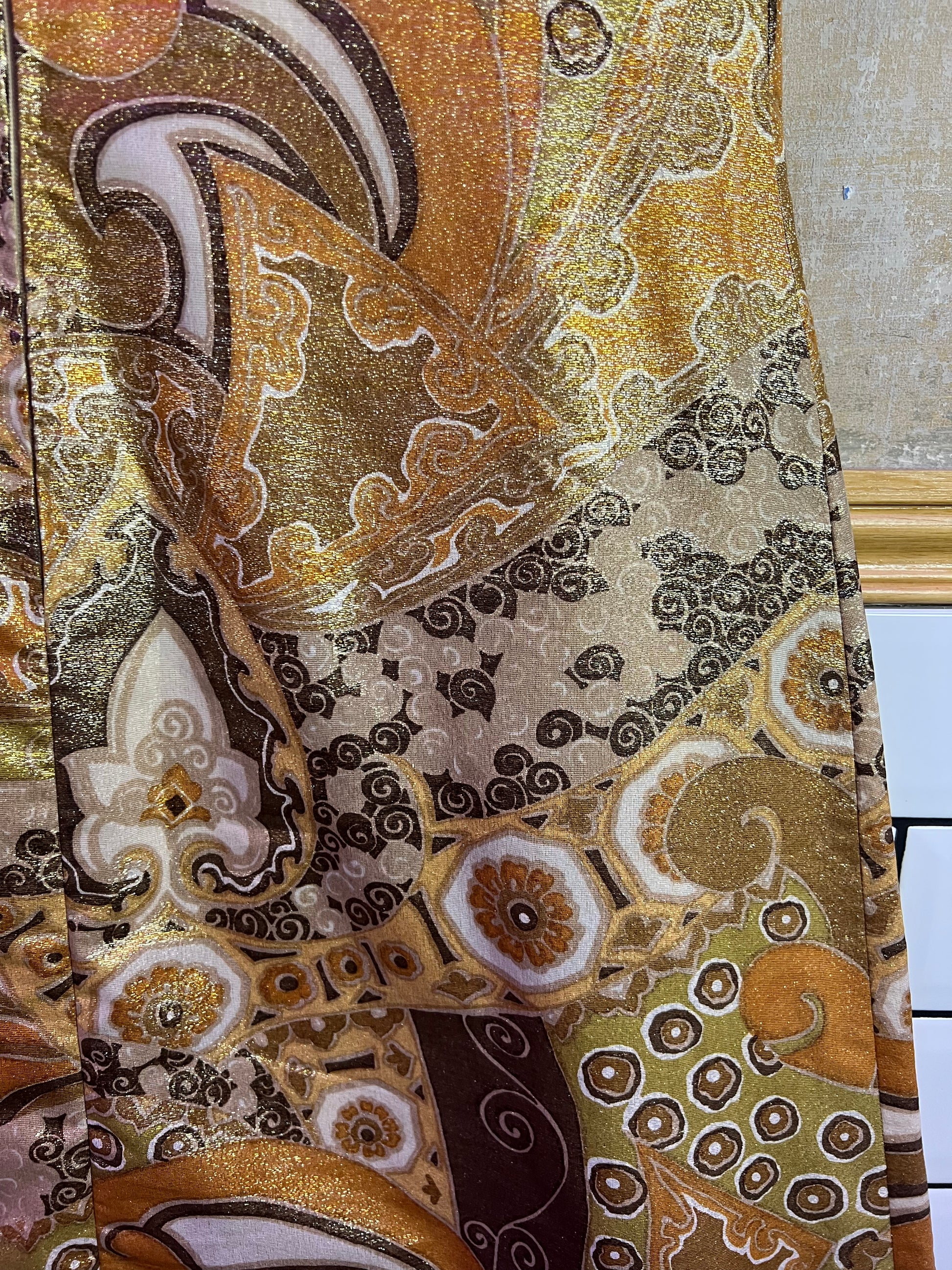 Je suis tombée en amour pour cette magnifique robe longue en lurex style 60s et « faite maison » par une couturière au Portugal!!! Les couleurs aux nuance dorées et bronzes, sa forme évasée : elle est parfaite et unique!!!