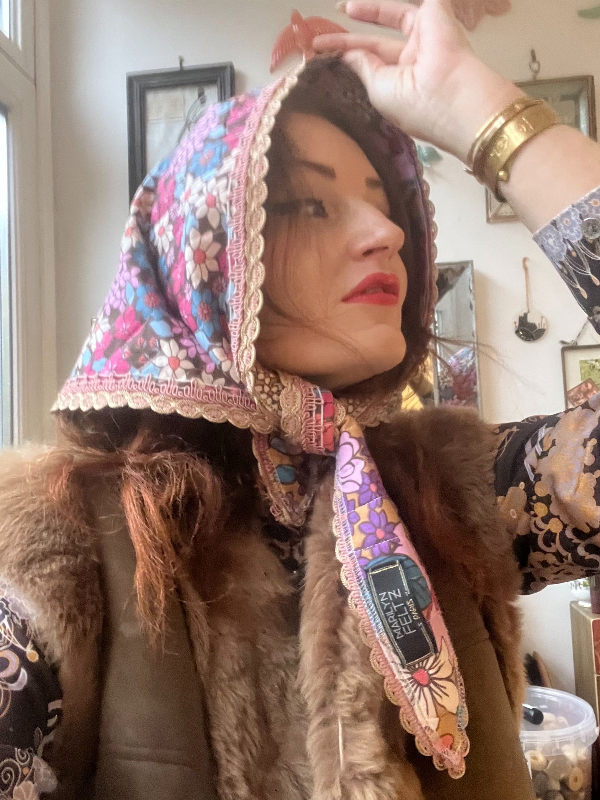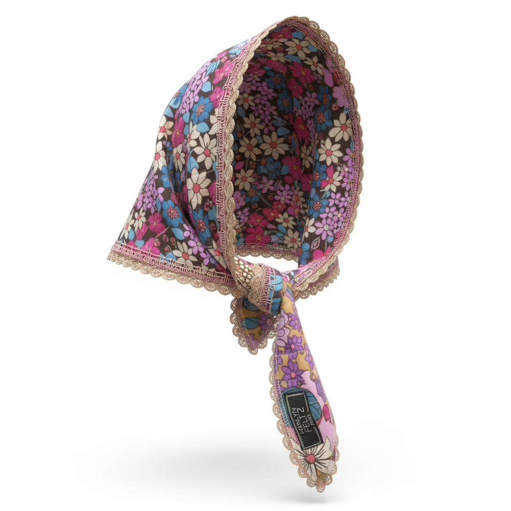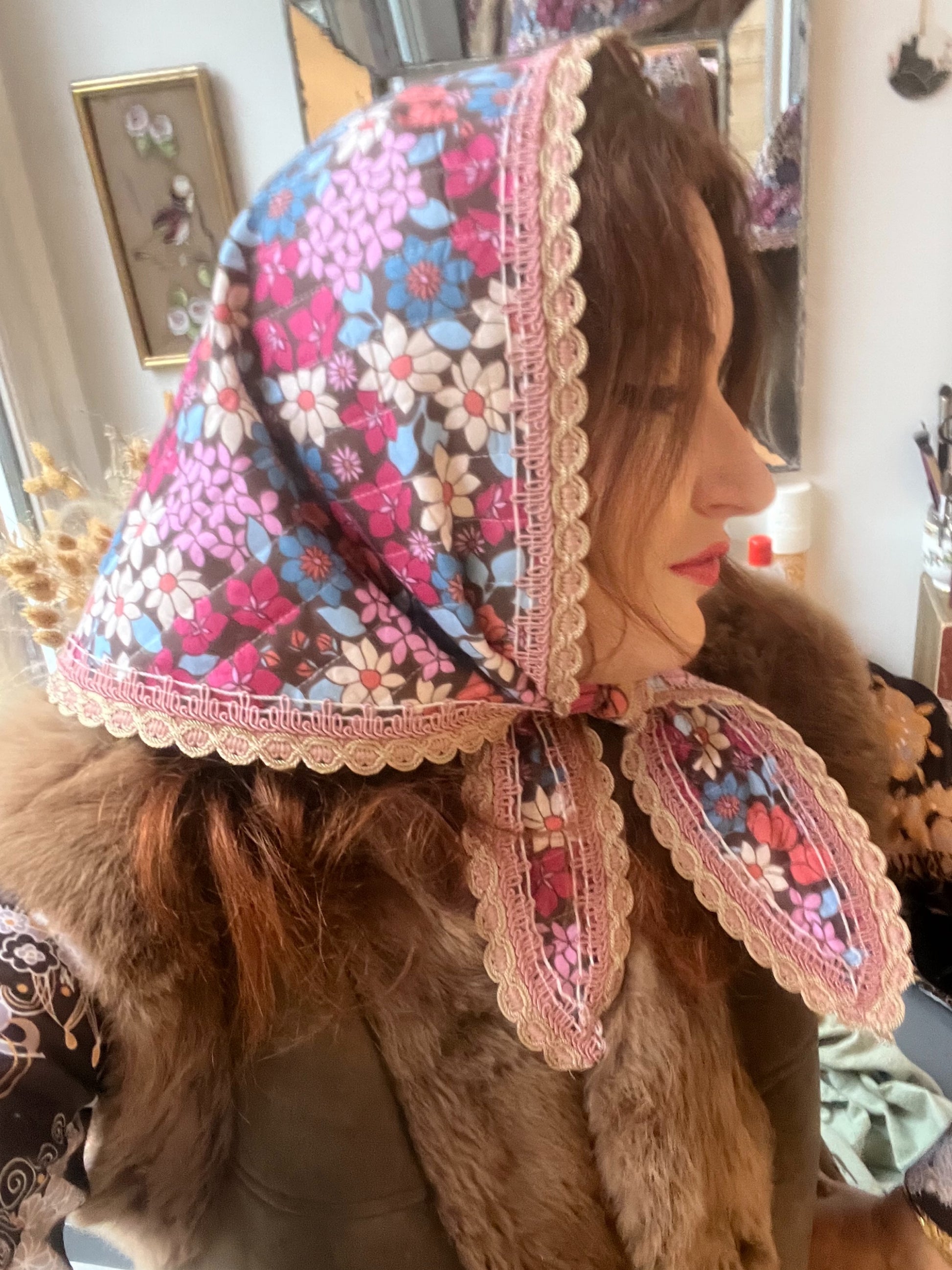 Fichu en tissu matelassés fleuri avec bordures en galons anciens.
