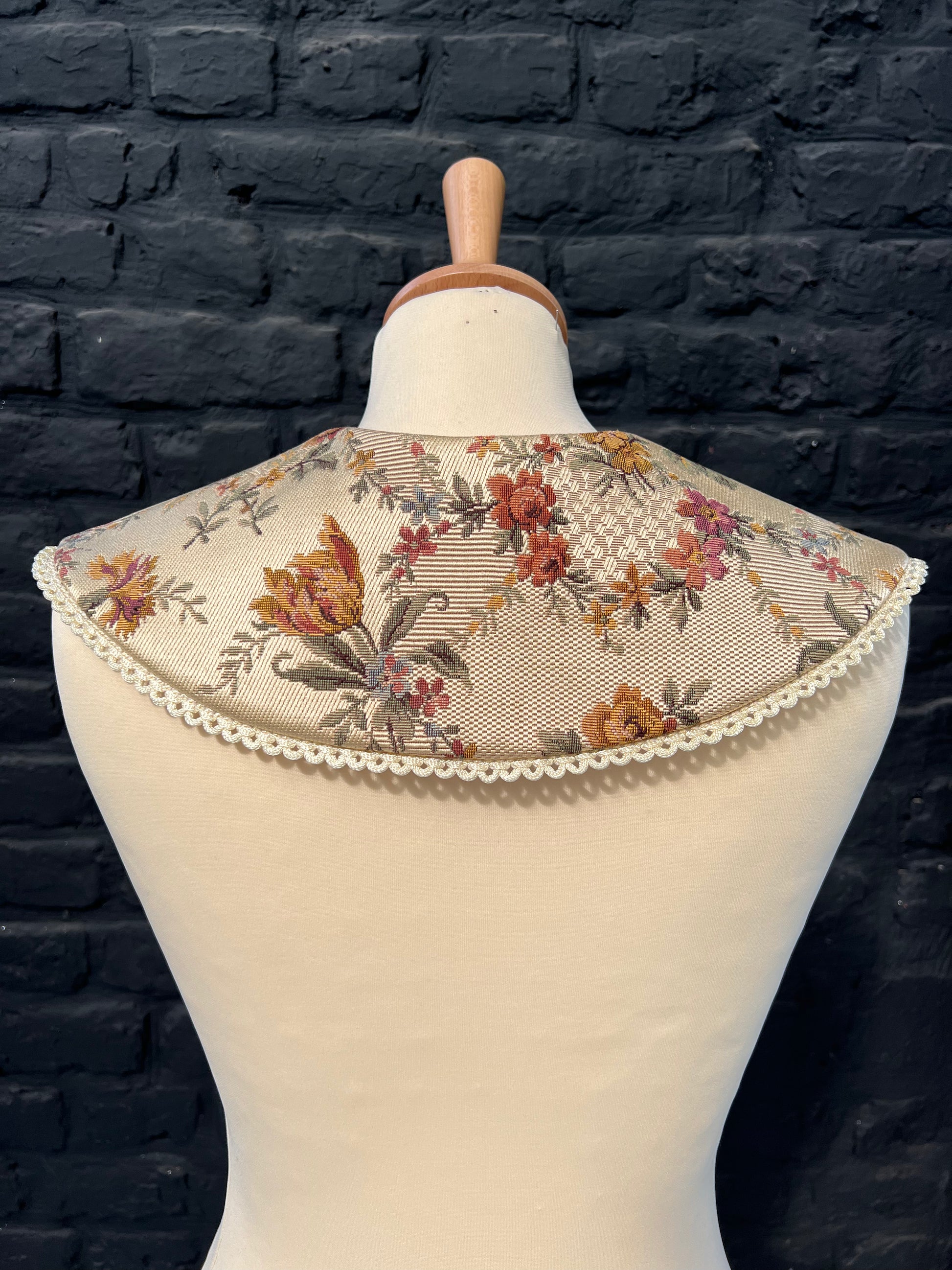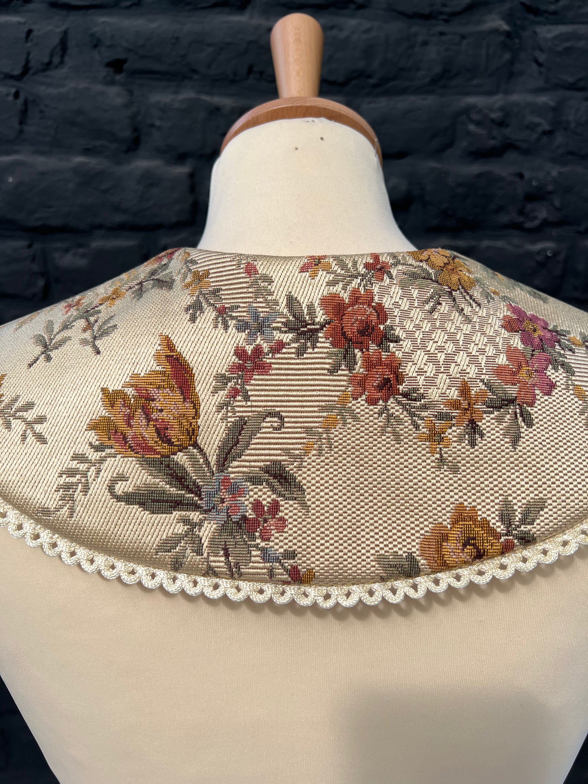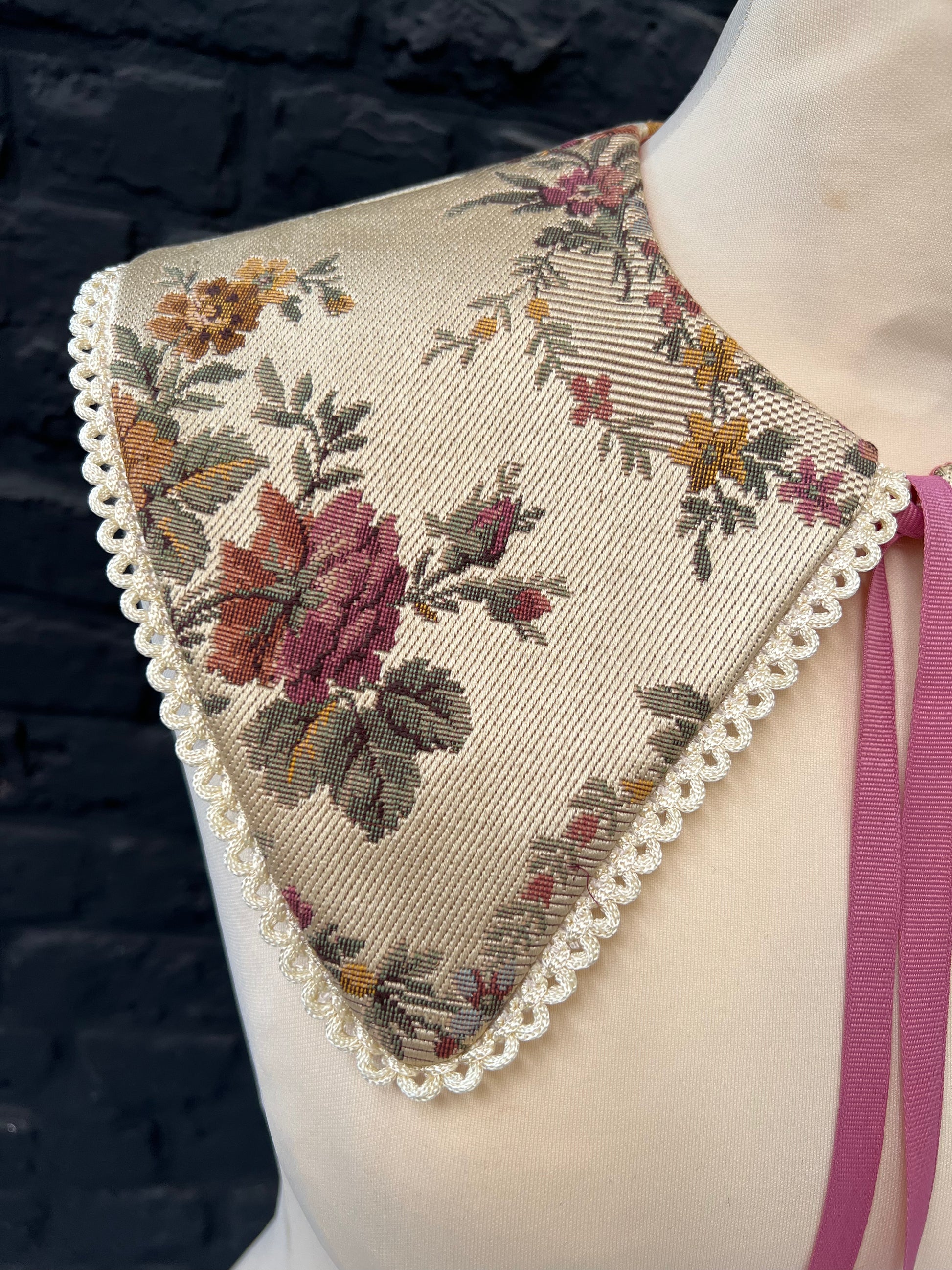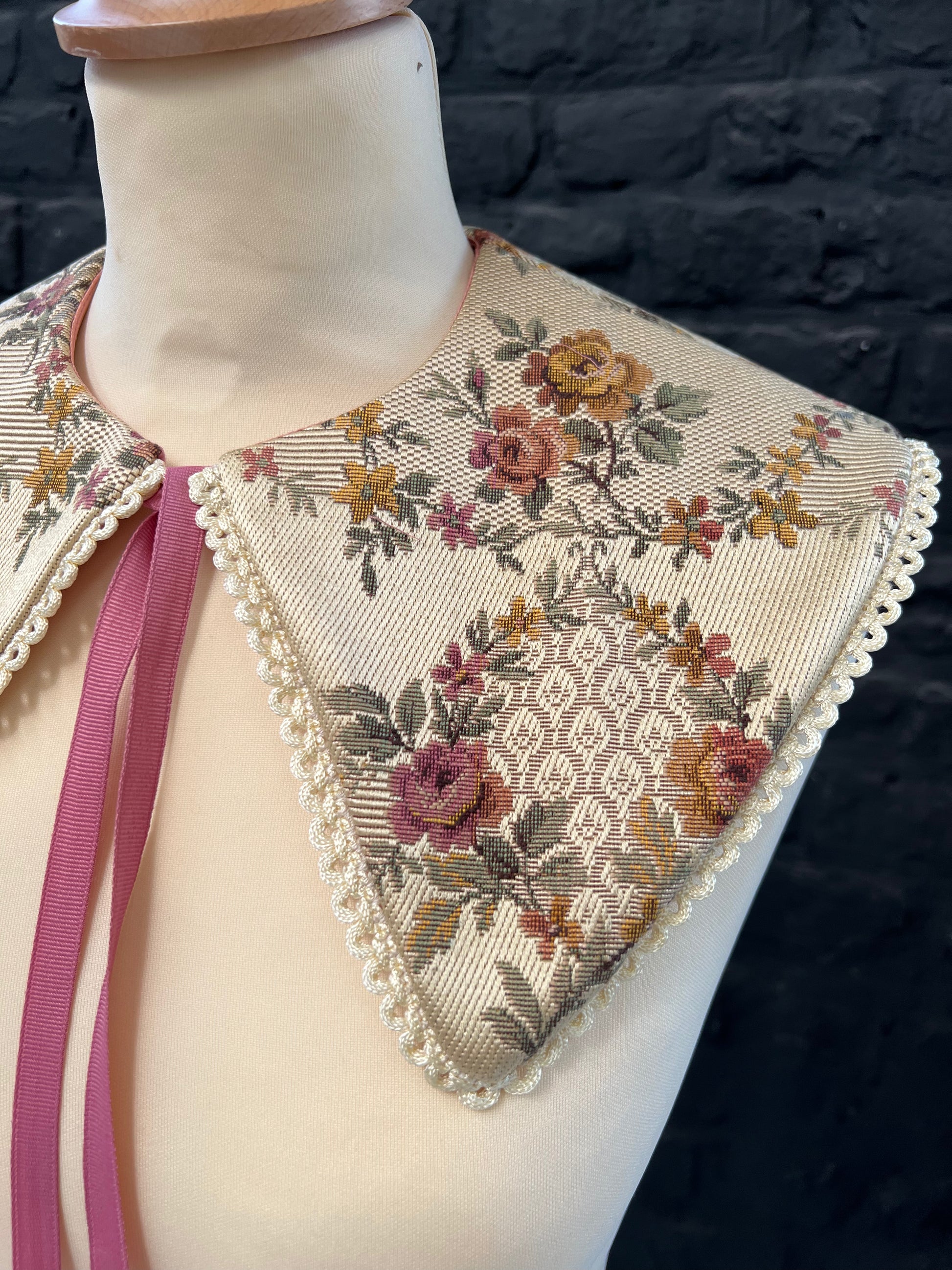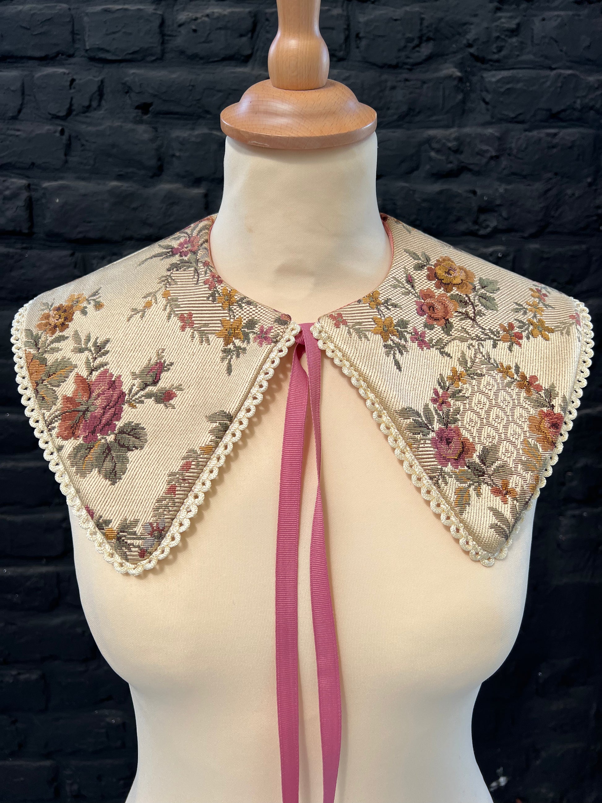 Roubaix était au siècle dernier le berceau de la couture en France, et ses compétences rayonnaient dans le monde entier! La ville était connue non seulement pour ses ateliers mais aussi pour ses magnifiques tisseurs. Il y a quelques mois, une dame s’est présentée à moi, elle avait en sa possession les archives d’un tisseur roubaisien, essentiellement des jacquards à couper le souffle comme neufs datant de 1910!  Je lui ai racheté ces coupes et en ai fait des collerettes! Entre accessoires rehaussant une tenue, et bijoux à part entière, ces collerettes sont quasi uniques ; je n’ai pu couper que quelques pièces par coloris. Elles sont toutes doublées d’une très belle soie corail et agrémentées soit d’un petit volant ou d’un gallon en dentelle. Une pièce de collection à nouer joliment sur le devant avec son ruban!