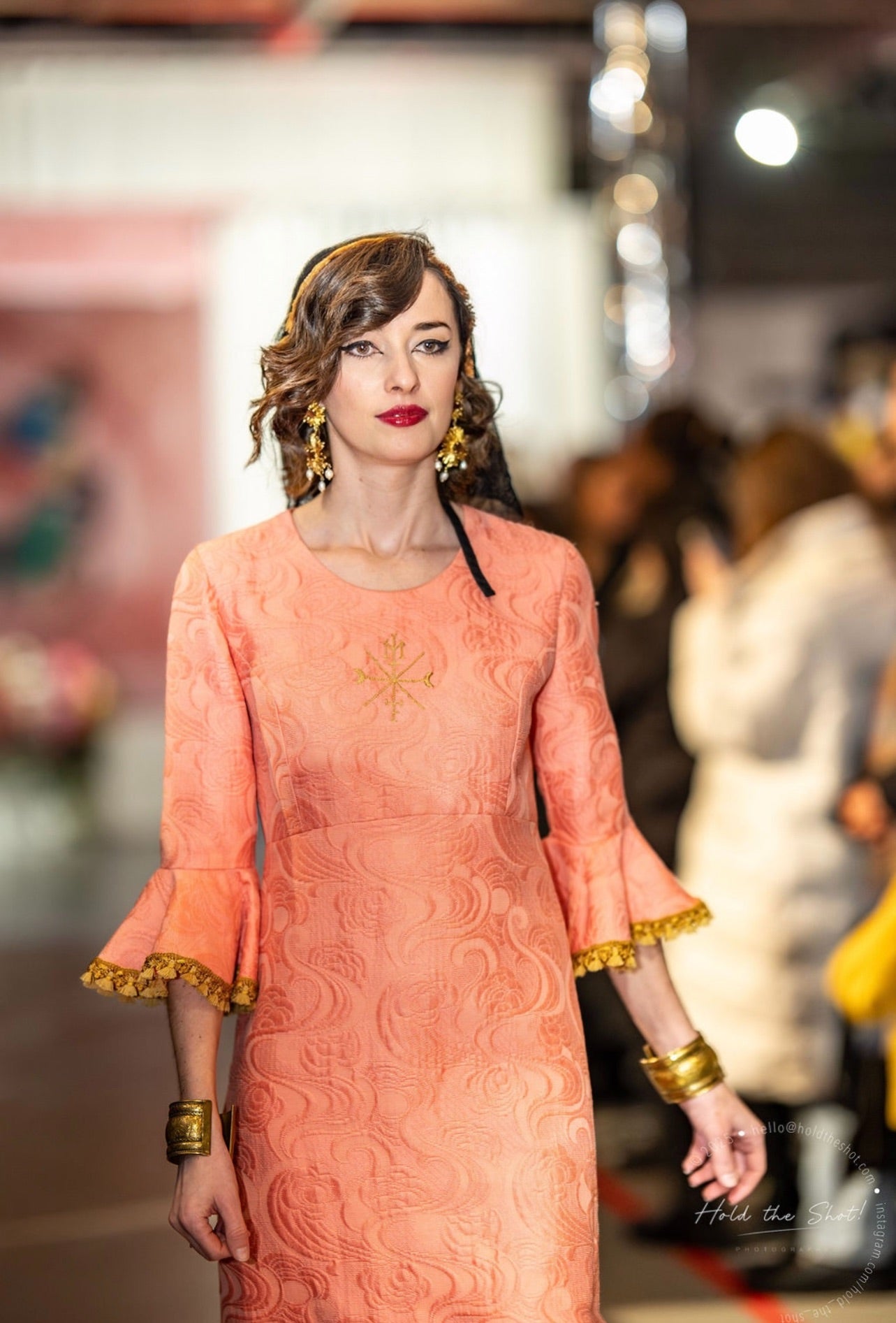 Robe en damassé corail manches clochettes et volant sur le bas, grand zip à l’arrière. Galons dorés en bordures. Logo magique doré brodé sur le devant. Doublée satin corail.
