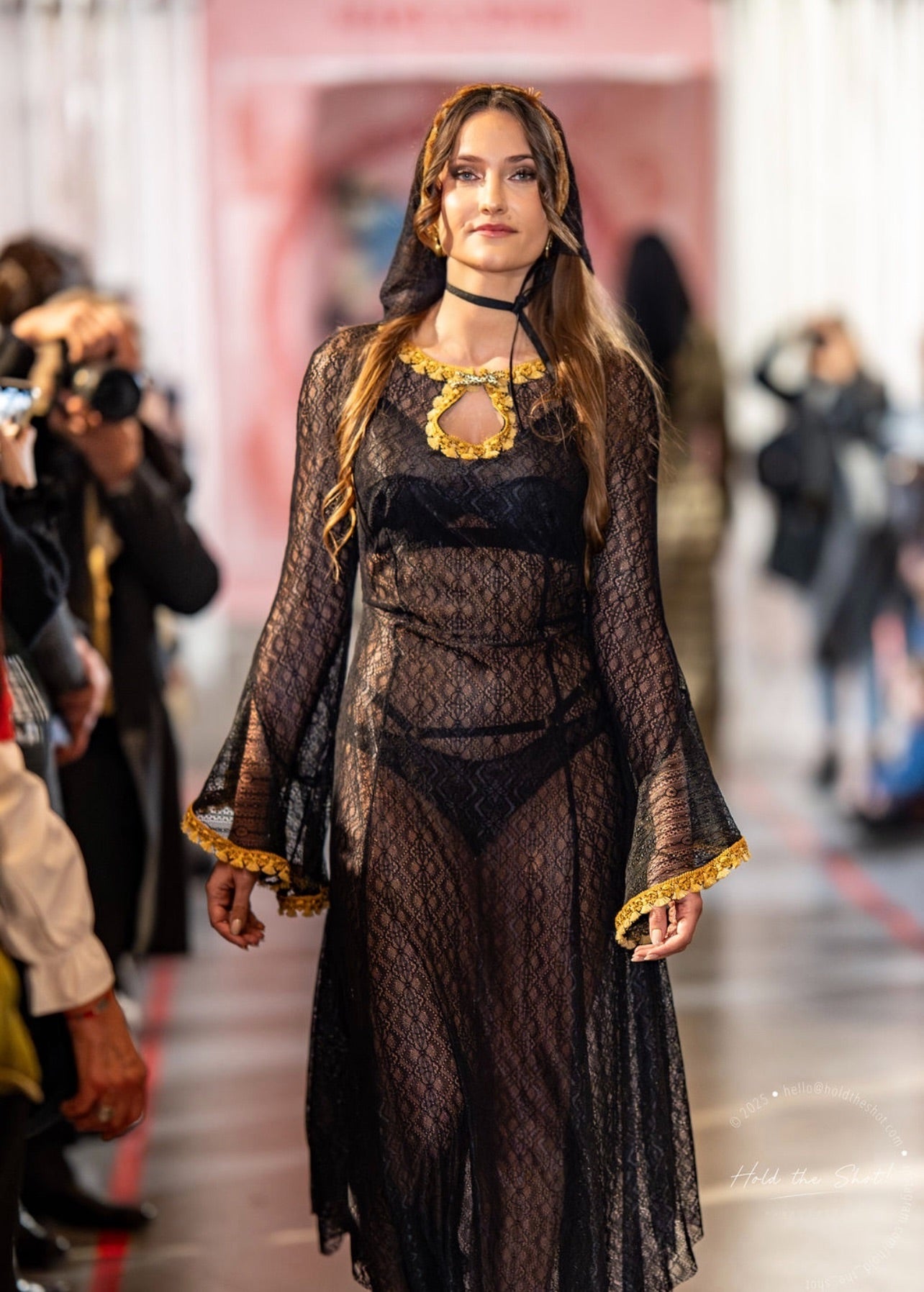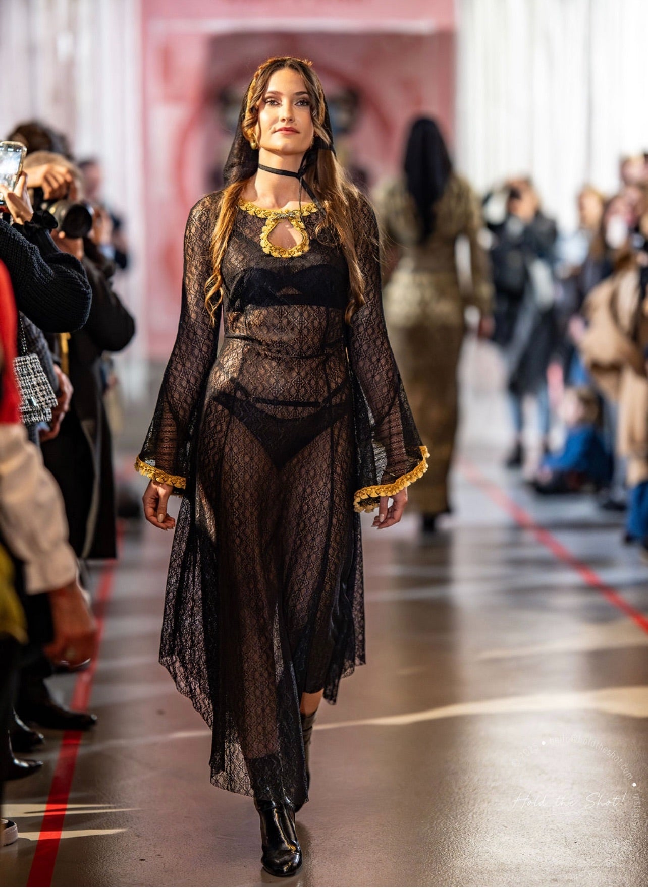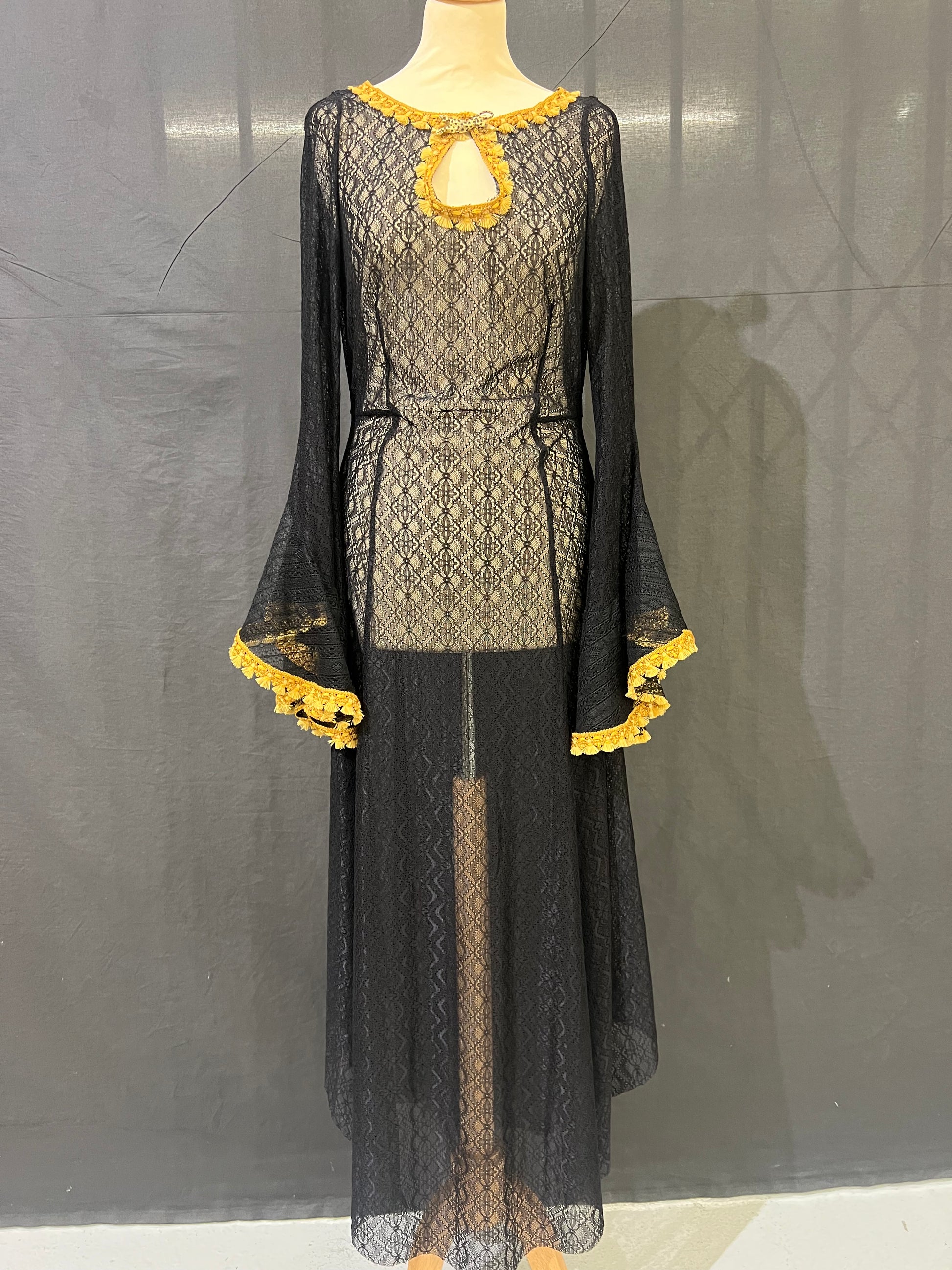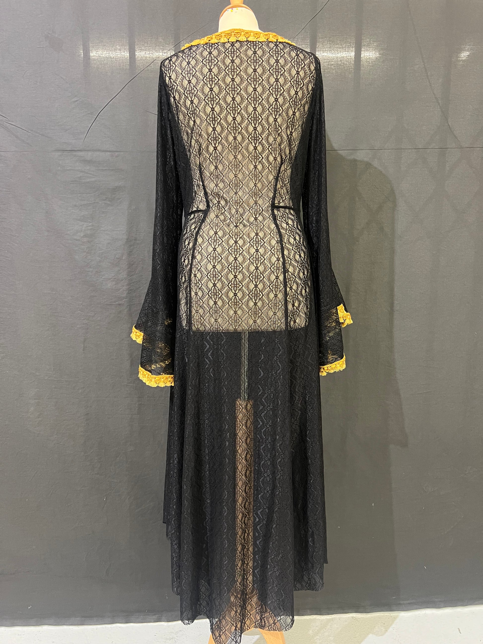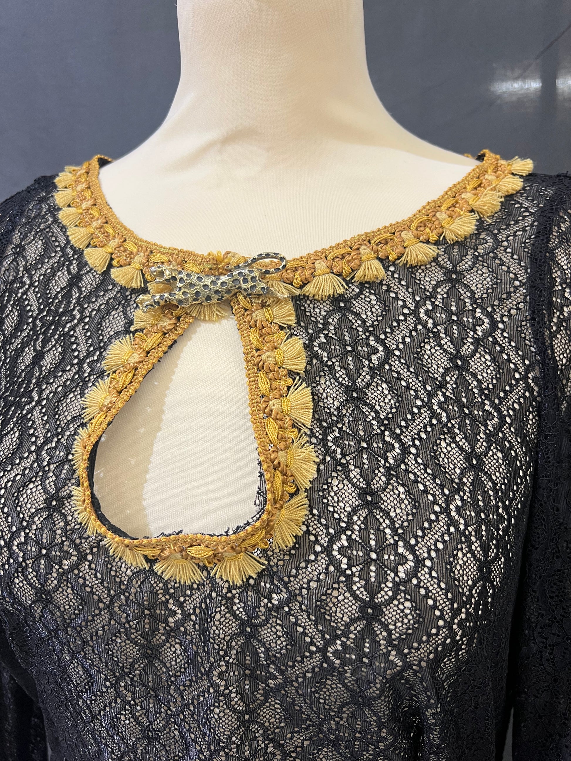 Robe longue en dentelle extensible. Manches papillon avec galons pompons dorés. Décolleté goûte avec broche léopard.